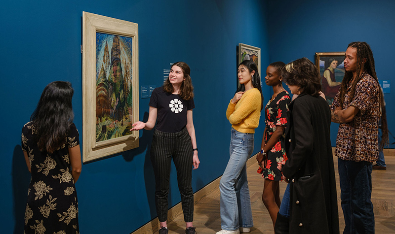 A Gallery guide discusses an artwork with a group of students.